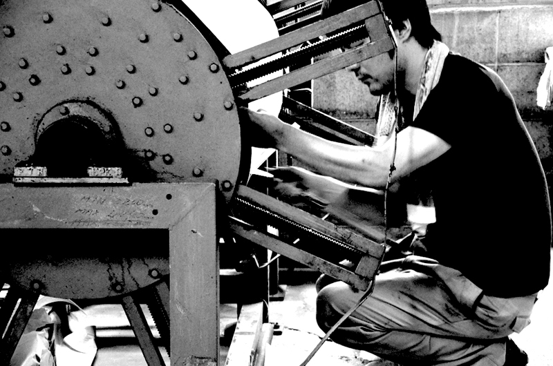 ボビンに巻き付けた130ヶの糸を回転板に取付け、それを回転する事で菱目模様の糸入紙が出来上がります。
