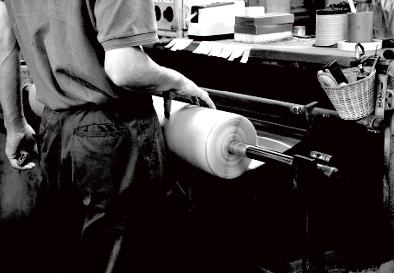 - 紙管は細くスリッターした紙を何層にも重ねて筒にします。転写ロールで紙の裏面に糊を塗布しています